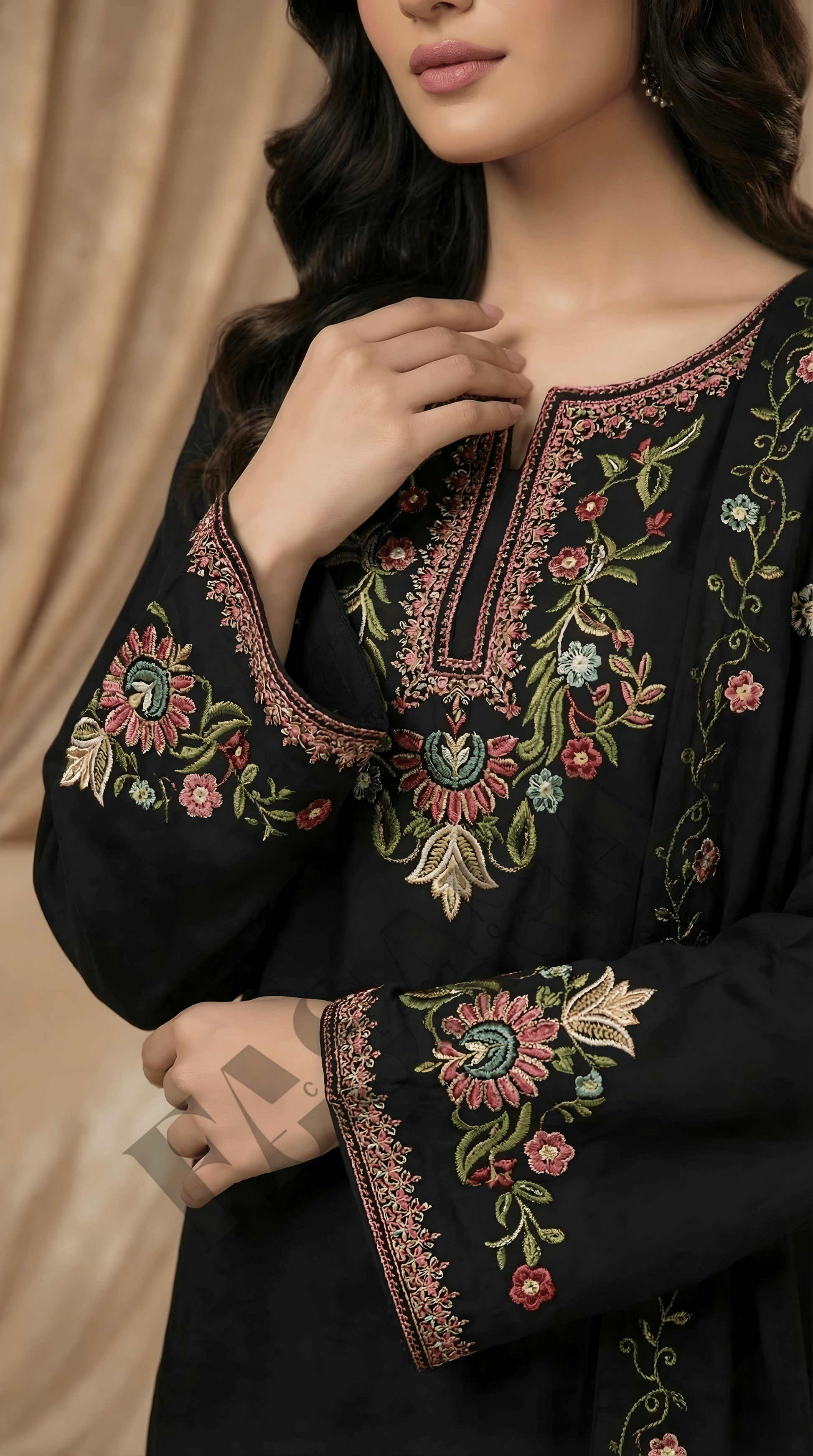 Add timeless elegance to your winter wardrobe with this stunning Dhanak 3-Piece Unstitched Suit, designed in a classic black shade and enhanced with beautiful multicolor floral embroidery. This outfit offers the perfect balance of warmth, comfort, and sophistication—ideal for everyday wear, evening gatherings, and semi-formal occasions.