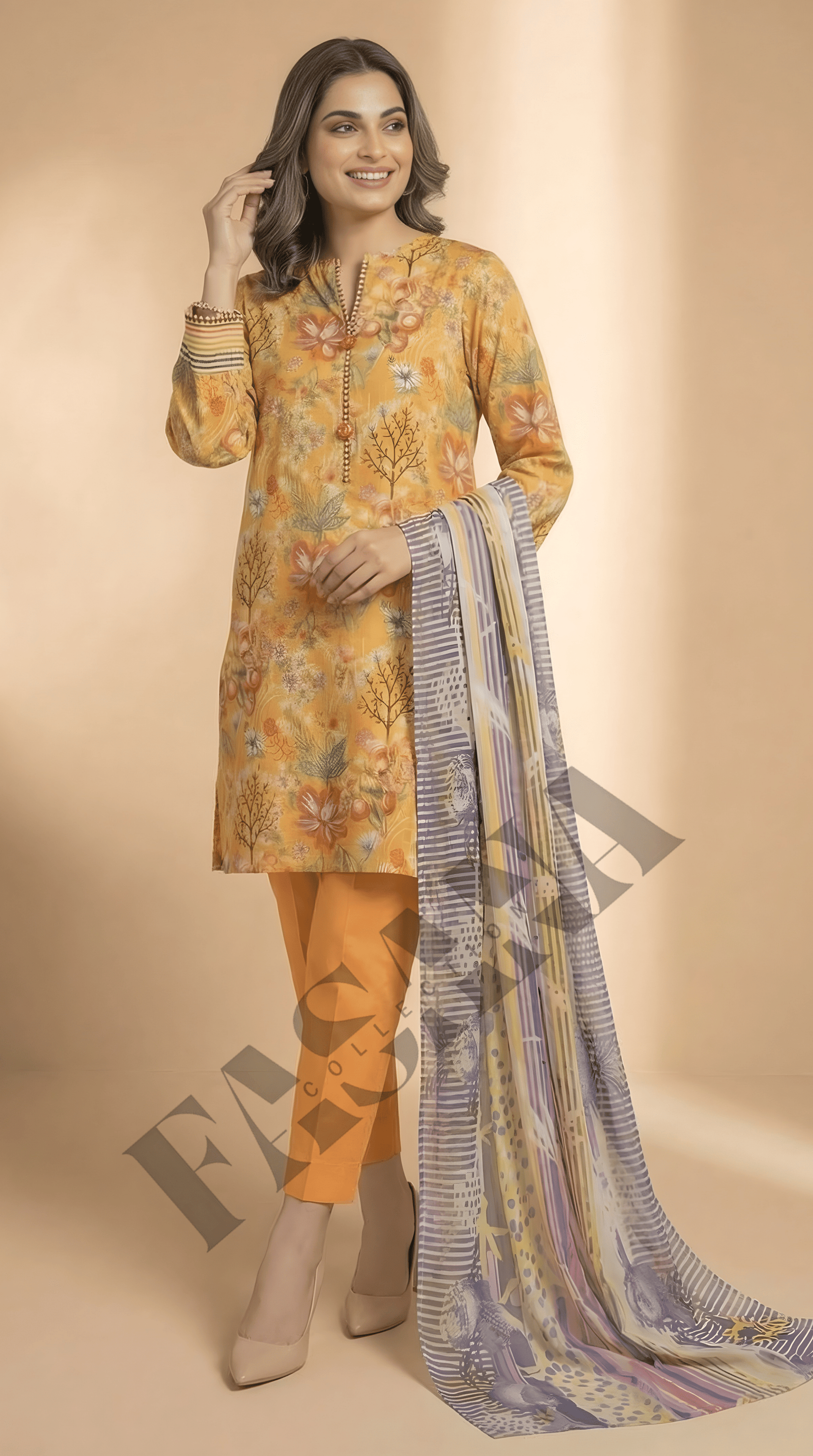 3-Piece Sapphire Suit in a rich mustard shade. The shirt features elegant floral and tree-inspired prints with detailed cuffs, paired with a solid dyed trouser for a balanced look. The outfit is completed with a stylish multi-tone printed khaddar, adding sophistication and seasonal warmth. Perfect for winter day wear, casual outings, and semi-formal gatherings.